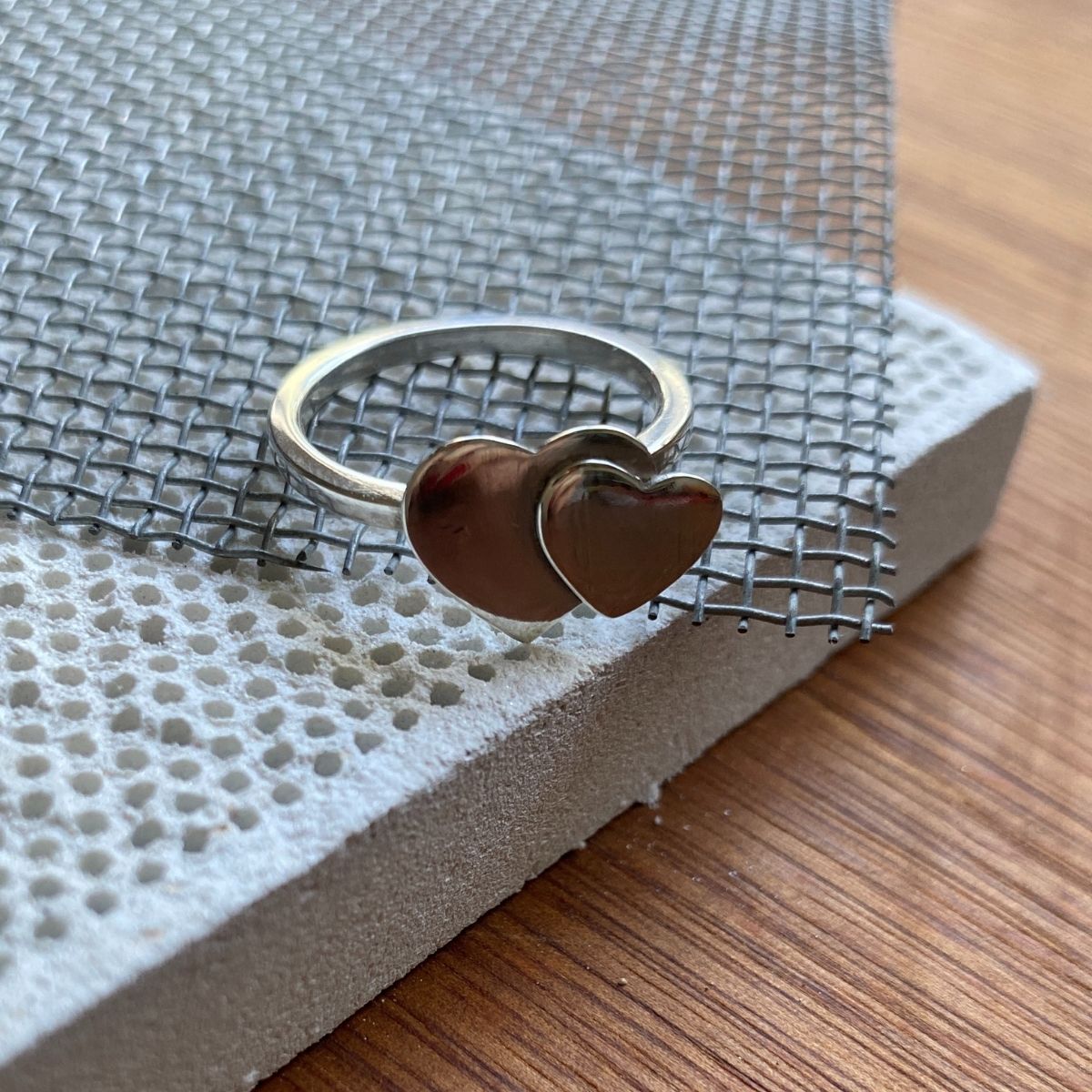 O Anel 2Corações é uma joia autoral feita 100% à mão em prata 950, com acabamento artesanal impecável e um design delicado e simbólico. A peça apresenta dois corações entrelaçados, representando os grandes amores da vida.